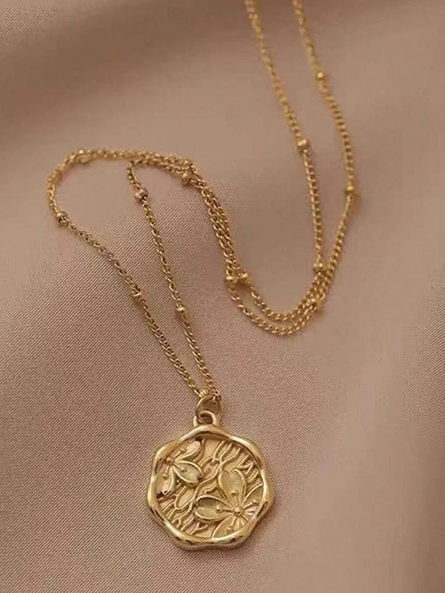 1pc Round Plate Peach Blossom Imprint Pendant Necklace Non-Fading